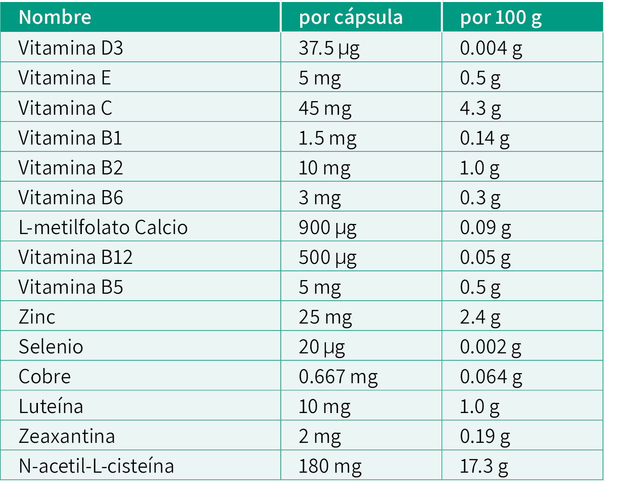 Aceite de colza refinado, N-acetil-L-cisteína, vitamina C (calcio-L-ascorbato), luteína y zeaxantina extracto oleoso de Caléndula (Tagetes erecta), estabilizante (cera de abejas), emulgente (lecitinas de girasol), óxido de zinc, aroma natural de naranja, vitamina E (D-alfa-tocoferol), vitamina B2 (riboflavina), vitamina B6 (piridoxal-5'-fosfato), vitamina B5 (D-pantotenato de calcio), gluconato de cobre, vitamina B1 (mononitrato de tiamina), vitamina D (colecalciferol), L-metilfolato de calcio, L-selenometionina y vitamina B12 (Methylcobalamin). Cubierta de la cápsula: gelatina, glicerina, agua, sorbitol y colorantes (óxido y hidróxido de hierro amarillo, complejos cúpricos de clorofilas).
