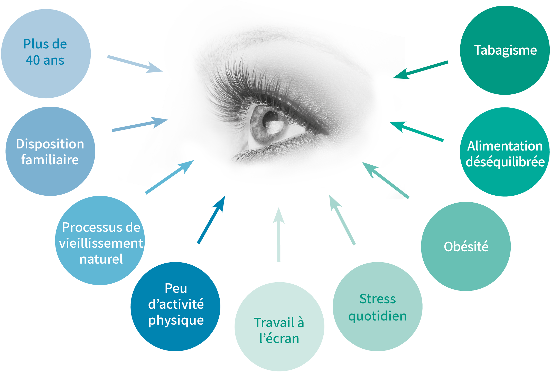 Dans la vie quotidienne, des facteurs de risque peuvent affecter la santé, en particulier celle des yeux, et conduire imperceptiblement au développement de changements chroniques. Une concentration élevée d'espèces réactives de l'oxygène affecte le transport et la transformation des nutriments (stress oxydatif).