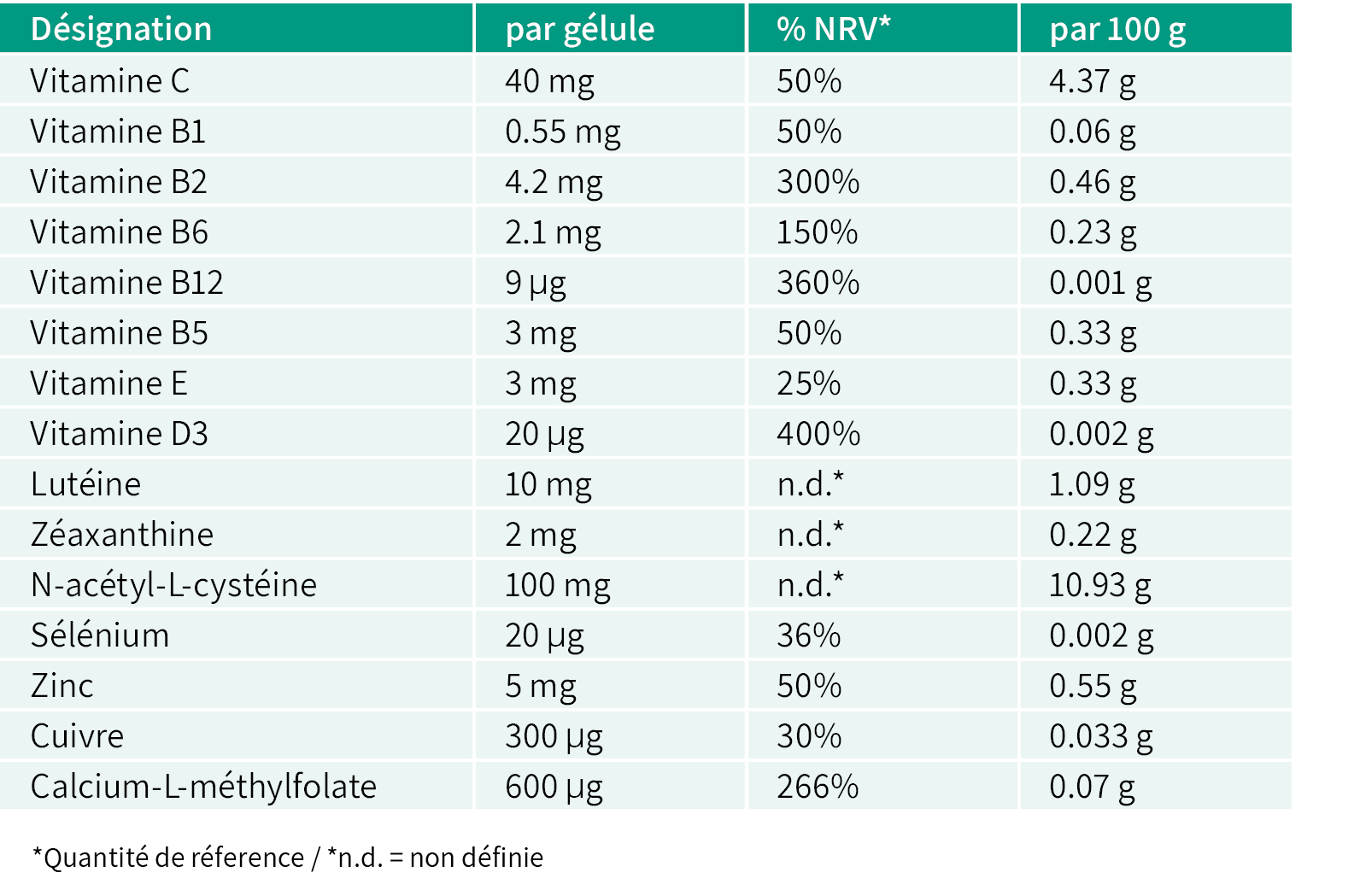Ingrédients : Huile de colza raffinée, N-acétyl-L-cystéine, vitamine C (L-ascorbate de calcium), lutéine et zéaxanthine, extrait huileux de souci (Tagetes erecta), stabilisant (cire d'abeille), émulsifiant (lécithine de tournesol), oxide de zinc, arôme naturel d'orange, d-alpha-tocophérol (vitamine E), vitamine B2 (riboflavine), vitamine B6 (phosphate de pyridoxal 5'), vitamine B5 (D-pantothénate de calcium), gluconate de cuivre, vitamine B1 (mononitrate de thiamine), cholécalciférol (vitamine D), L-méthylfolate de calcium, L-sélénométhionine et vitamine B12 (cyanocobalamine). Composition de l'enveloppe de la capsule : gélatine, glycérine, eau, sorbitol et colorant (oxyde et hydroxide de fer, complexes de cuivre des chlorophyllines).