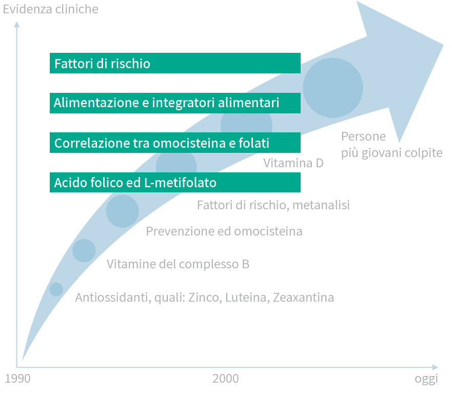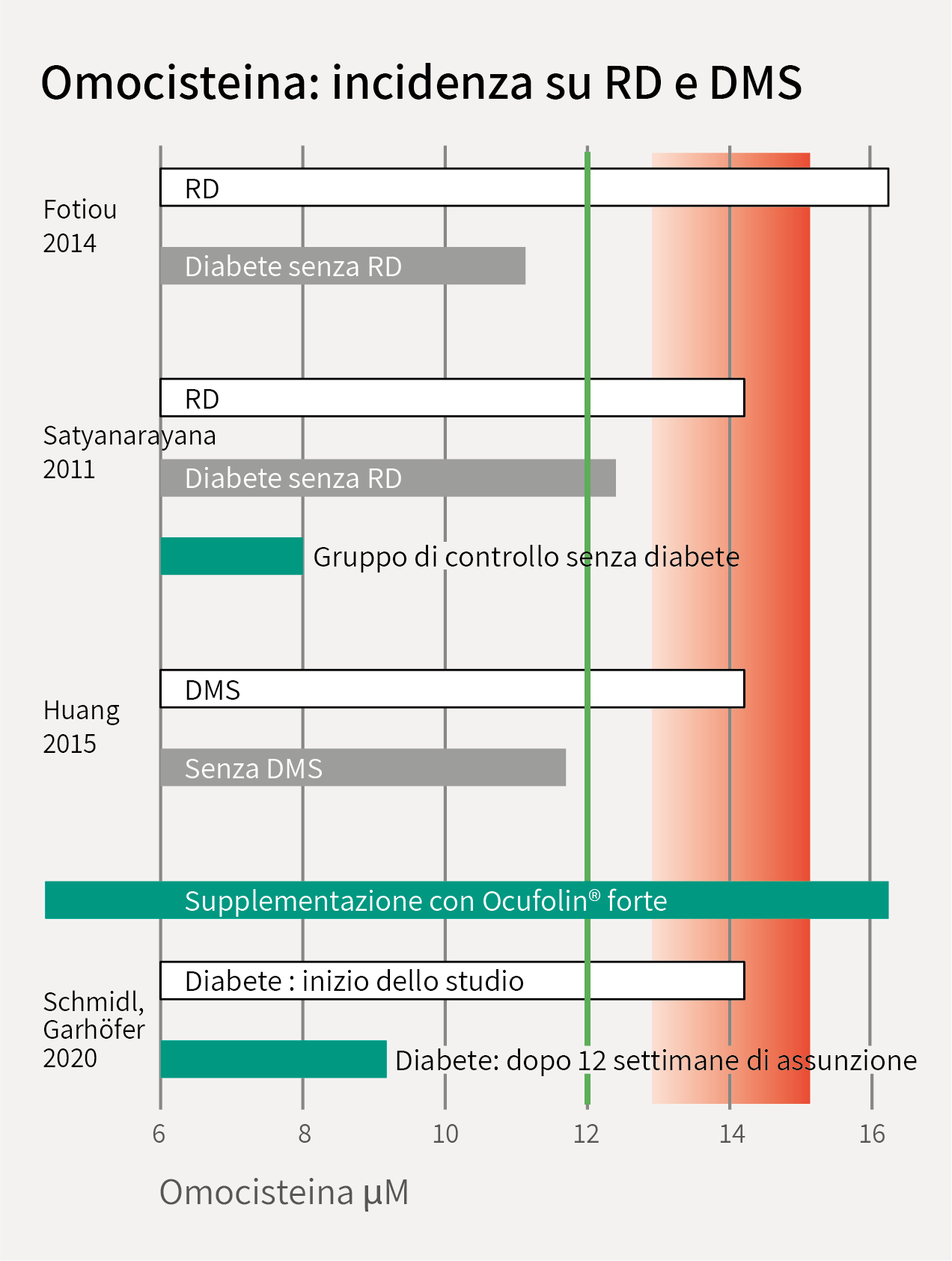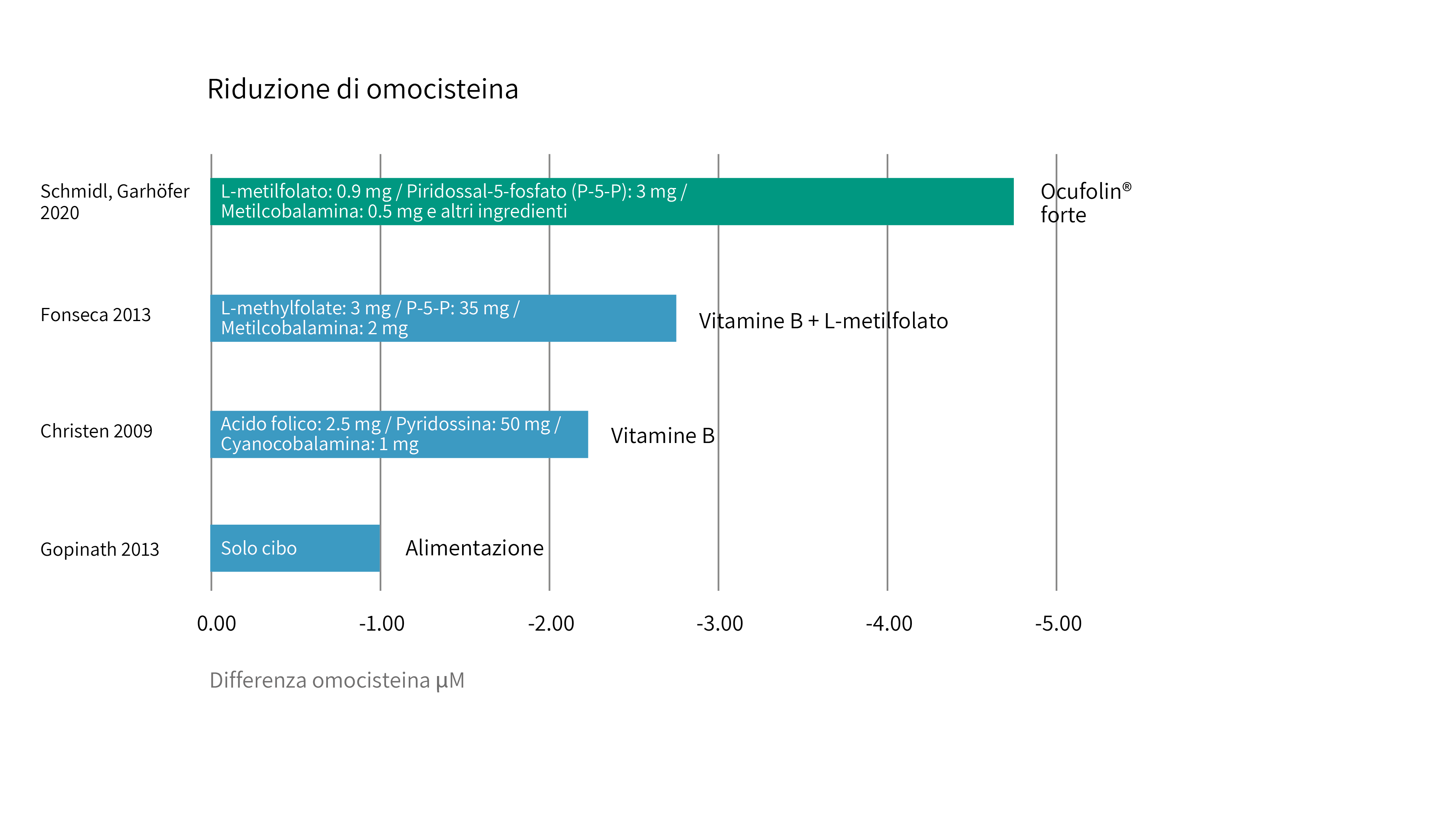 Fonti: 6: Chakravarthy et al., BMC Ophthalmology 2010, 10:31; 18: Areds Report No 19, Ophthalmology. 2005 April ; 112(4): 533–539; 15: Cougnard et al., Invest Ophthalmol Vis Sci, 2013; 54; 1905-1912; 7: Annweiler et al. Maturitas 2016 Jun; 88:101-12; 2: Xu et al., Diagn Pathol. 2014 Sep 26;9:167; 19: Lima et al., Int J Retin Vitr, 2016,2, 21; 20: Liu et al., BMJ Open, 2017, 7, e016280; 21: Luo et al., Nutrients, 2017, 9, 307: Schmidl, Garhöfer, Mol.Vis., 26, (2020), 326